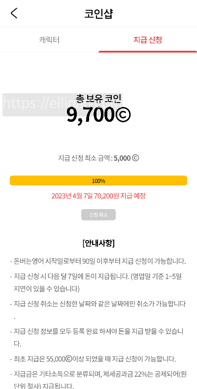 돈버는 영어는 시작일로부터 90일 이후부터 지급 신청이 가능하다. 90일을 매일 꼬박꼬박 했더니 90,700 코인이 쌓였다.