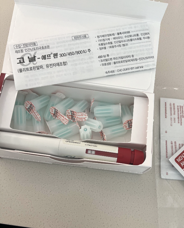 이제 배아를 만들려면 난자를 많이 만들어야 하기 때문에 배란 촉진제를 쓴다. 여러가지 약이 있겠지만 나는 배주사약인 고날에프 펜을 처방받았다. 월경 3일차인 내일부터 4일간 24시간 간격으로 일정한 시간에 맞은 후 5일차에 진료를 보며 난포가 잘 만들어지는지 확인하기로 했다. 고날에프 펜 900IU 두개를 받아서 300IU씩 4일을 맞고, 남은 600IU는 가져오라고 했다. 고날에프는 냉장보관이다. 주사실에서 뱃살이 전혀 없어보이는 간호사선생님이 뱃살을 끌어모아 잡고 주사를 놓는 시늉을 하시며 친절하게 설명해주시고는 아이스팩이 들어있는 보냉가방에 고날에프900IU 두상자를 담아주셨다.