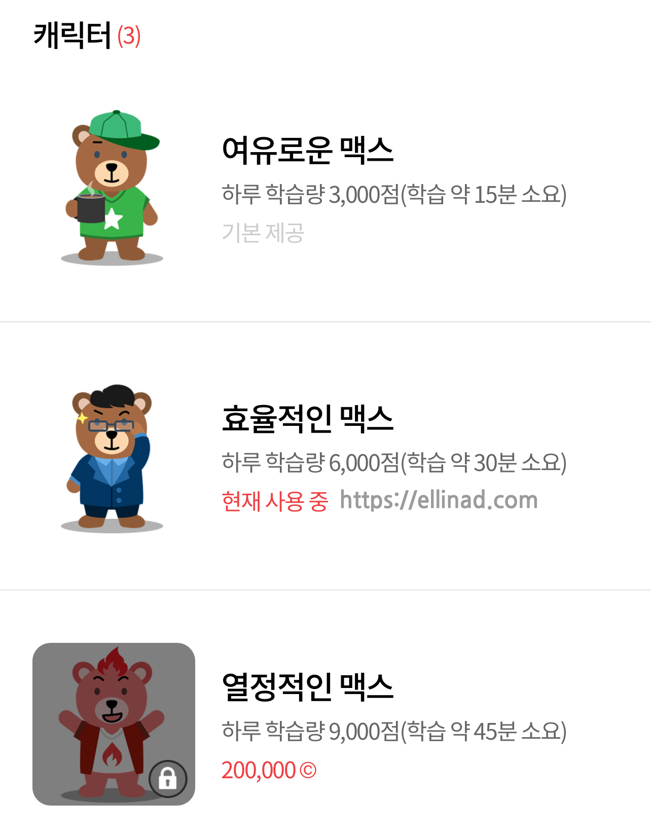 처음에는 20만 원짜리 열정적인맥스 캐릭터가 너무 비싸게만 느껴졌는데, 하루 45분 수업이 가능하다면 학습레벨이 어느 정도 올랐을 때 열정적인 맥스를 구매하면 시너지가 올라갈 것 같다.
