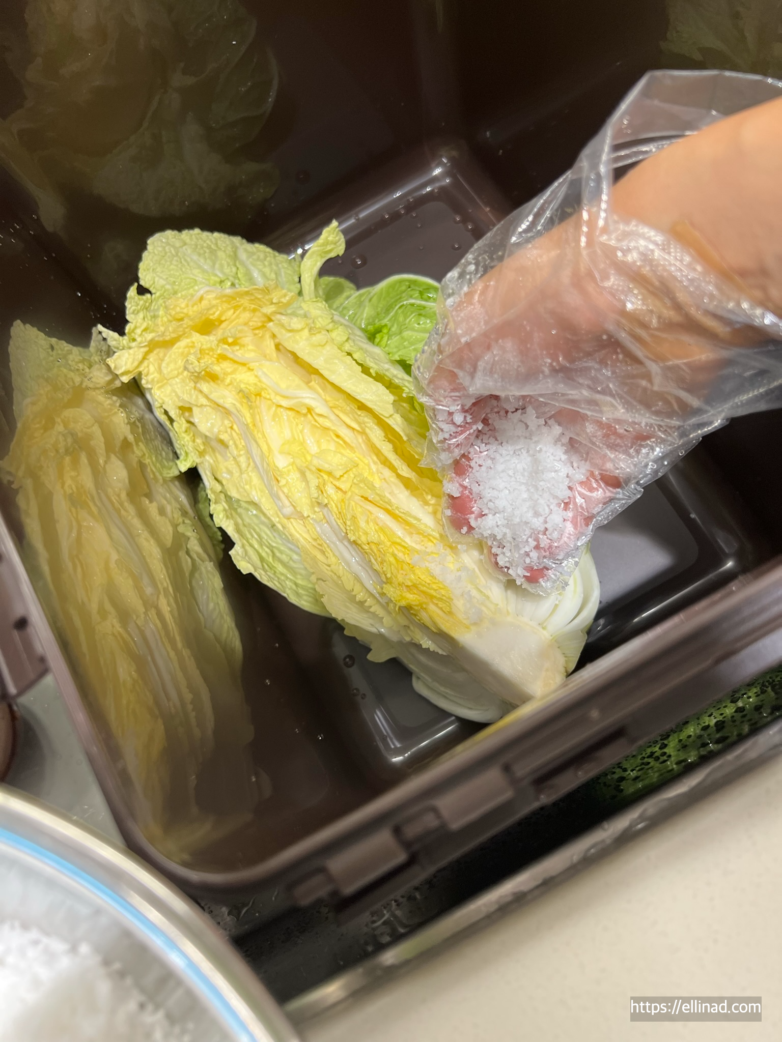 배추 3통을 위한 소금을 덜어두고, 그 반을 중간사이즈 김치통에 넣고 3리터의 물을 부어 물을 녹였다. 바닷물보다 조금 더 짠 정도였다. 배추를 절여둘 큰 김치통을 옆에다 두니 싱크대가 꽉 찼다. 배추를 중간 김치통에 있는 소금물에 담가서 큰 김치통에서 소금을 뿌려 절일 준비를 마쳤다.