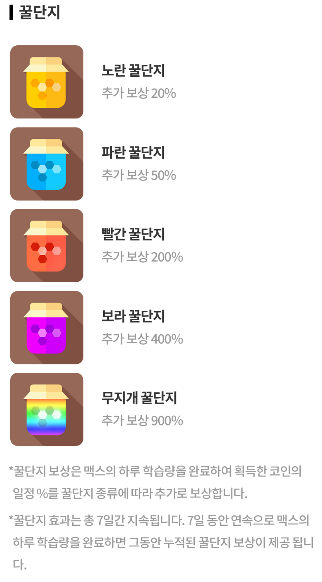 1주일간 연속으로 학습완료를 해야 꿀단지를 받을 수 있으며, 또 1주일간 연속으로 학습완료를 해야 꿀단지에 해당하는 추가보상을 받을 수 있다.