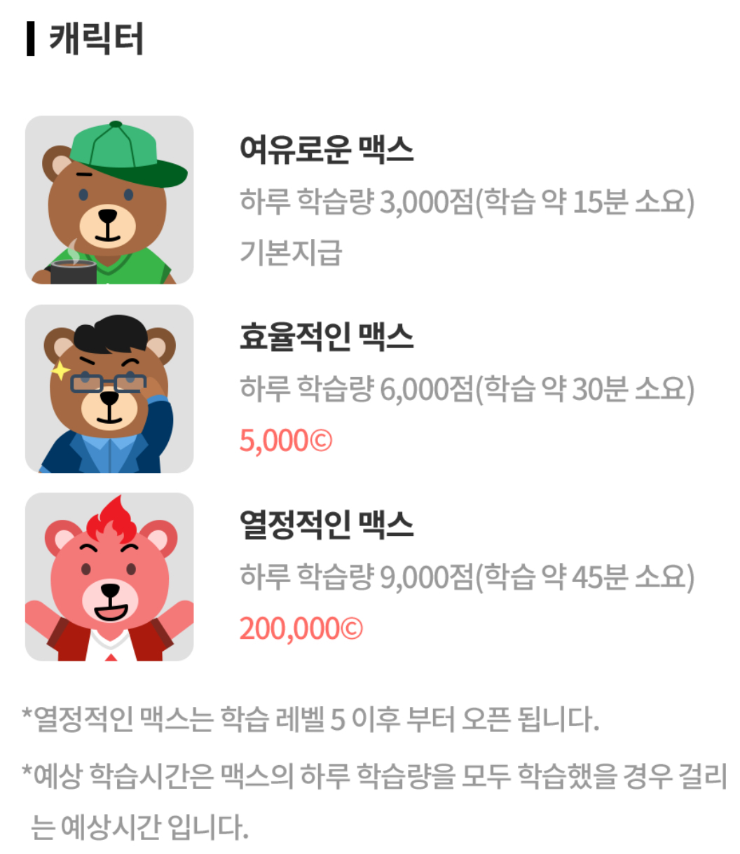 스피킹 맥스의 학습레벨은 누적 학습일에 따라 정해지며, 레벨에 따라 1천점당 획득 코인ⓒ이 달라진다.