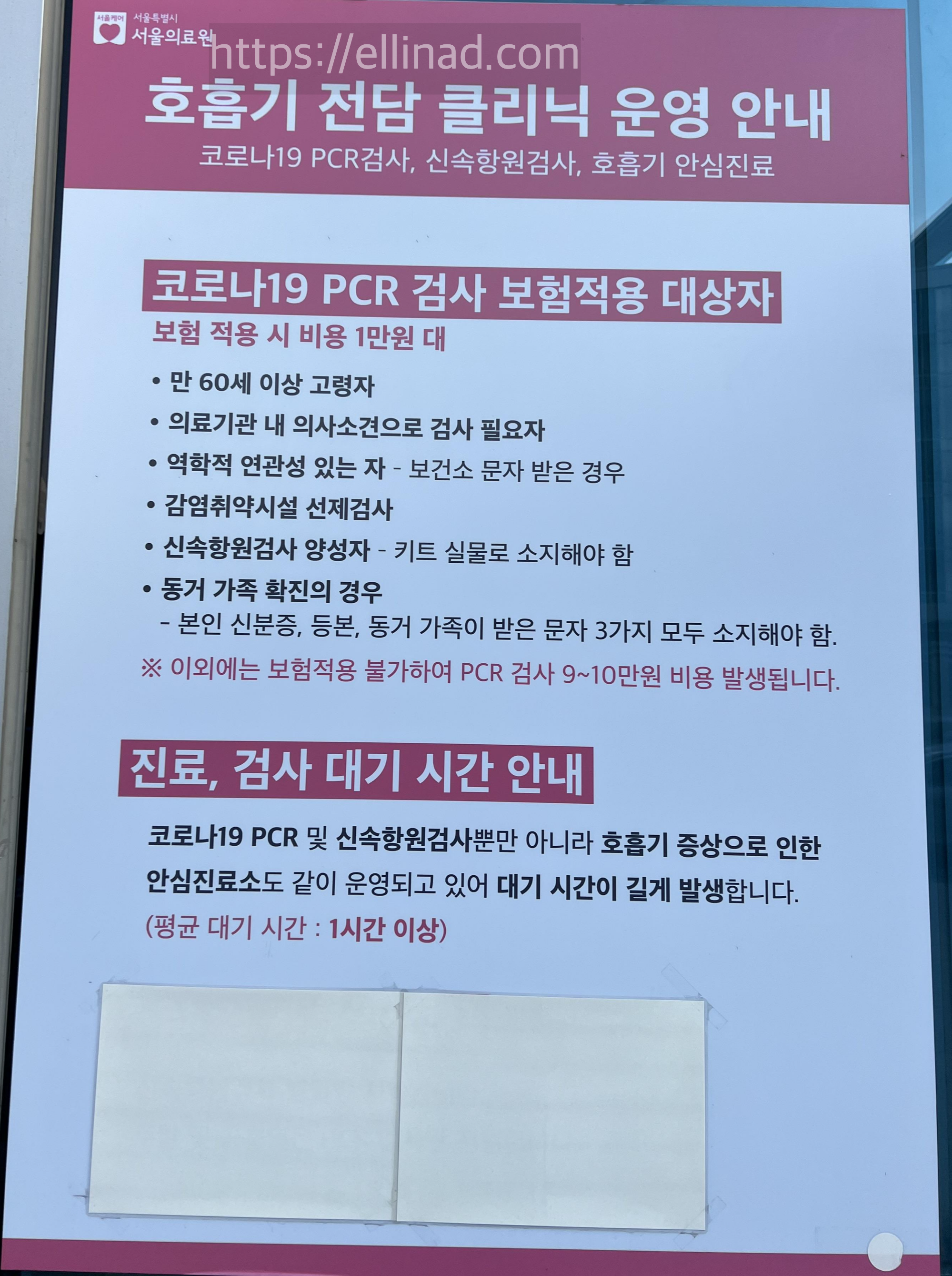 다음 날 서울의료원 호흡기 안심진료소에 자가키트를 가지고 갔지만 대기하고, 문진표도 작성해야만 검사를 할 수 있었다.