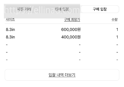 처음 상품 화면에서 체결거래 가격이 있는 곳 구매입찰 탭을 선택하면,