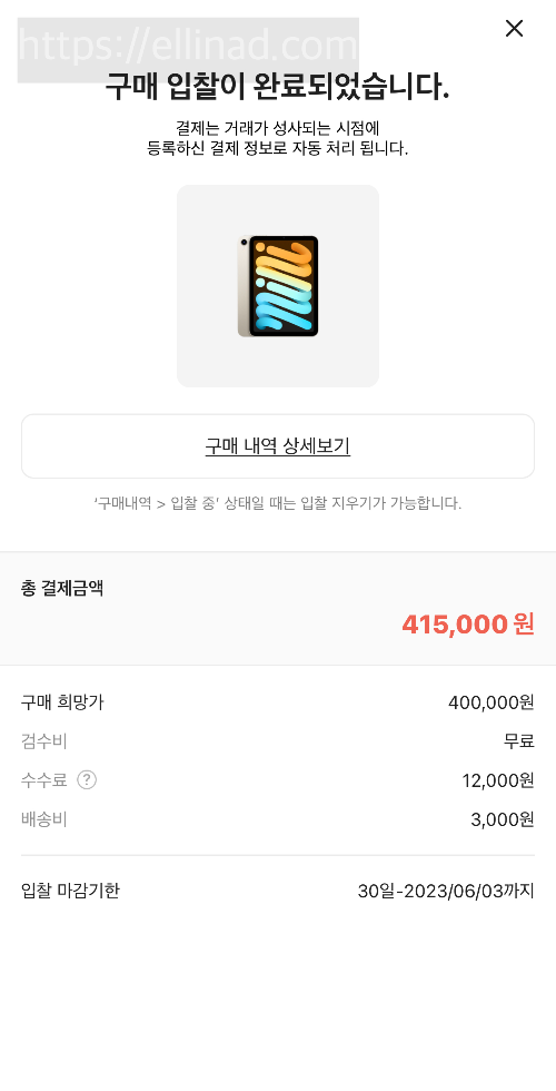 "구매입찰 완료" 버튼을 누르면 다음 화면이 나온다.