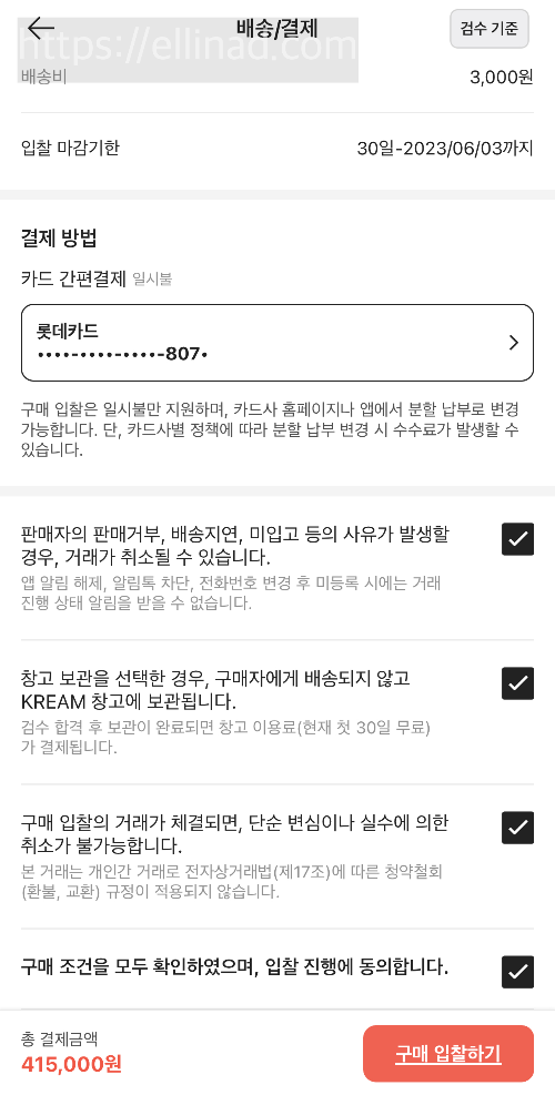 "구매입찰 계속" 버튼을 누르면 배송지 확인, 결제는 무슨 카드로 할 건지, 아래 동의내용이 주르륵 나온다.